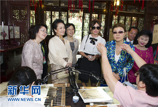 ????5月21日,國家主席習(xí)近平夫人彭麗媛邀請出席亞信上海峰會的部分國家領(lǐng)導(dǎo)人夫人共同觀看中國非物質(zhì)文化遺產(chǎn)展示和文藝演出。這是彭麗媛和來賓欣賞顧繡傳承人蘇惠萍用細(xì)若游絲的線一次成功穿過針眼。 新華社記者 黃敬文 攝