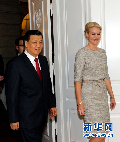 ??? 6月11日,正在丹麥進(jìn)行正式訪問的中共中央政治局常委、中央書記處書記劉云山在哥本哈根會(huì)見丹麥?zhǔn)紫唷⑸缑顸h主席托寧-施密特。 新華社記者饒愛民 攝