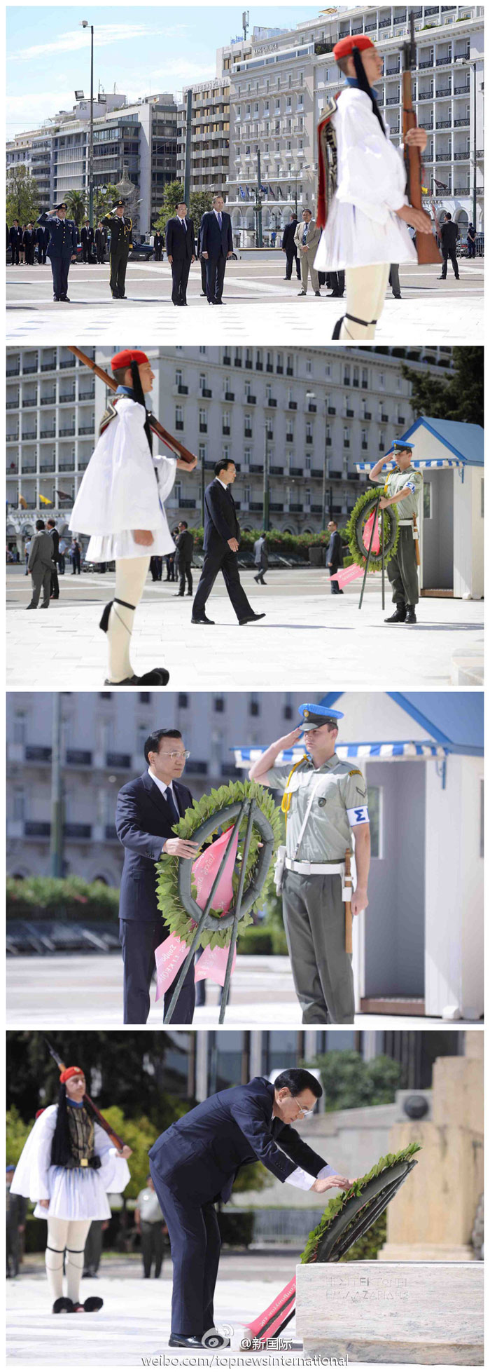 ??? 新華網(wǎng)北京6月20日電 據(jù)新華社“新國際”微博報道,正在希臘訪問的李克強(qiáng)總理19日向希臘無名戰(zhàn)士紀(jì)念碑獻(xiàn)花圈。該紀(jì)念碑1932年建成,碑上鐫刻公元前5世紀(jì)希臘政治家伯里克利斯一篇悼詞中的兩句名言:“全世界杰出戰(zhàn)士之墓”、“安放無名氏的床第”,及希臘從上世紀(jì)初到五十年代與外國交戰(zhàn)的戰(zhàn)役名稱和地名。