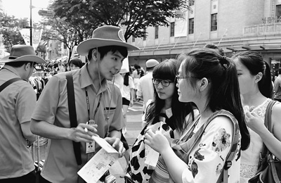 圖為中文旅游咨詢員李潤(rùn)雨(左二)正在熱心地為中國(guó)游客指路。本報(bào)記者 萬(wàn)宇攝