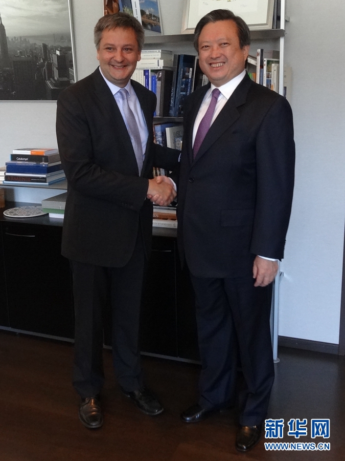 中國駐西班牙大使朱邦造與安道爾外交大臣薩沃亞會談前握手。新華網(wǎng) 周喆攝