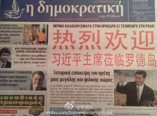 ????新華網(wǎng)北京7月14日電 據(jù)新華社“新國際”微博報道,希臘羅德島報紙《民主報》13日在頭版發(fā)表題為《一個偉大友好國家領導人的歷史性訪問》文章,并用中文紅色大字體寫著“熱烈歡迎習近平主席蒞臨羅德島”。文章說,熱情好客的羅德島人民祝愿習近平主席身體健康,祝愿中國在習主席領導下取得跨越式發(fā)展,祝愿中國繁榮昌盛。