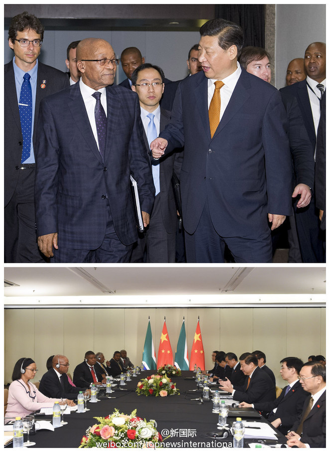 ???? 新華網(wǎng)北京7月15日電 據(jù)新華社“新國際”微博報道,習(xí)近平主席14日在巴西會見南非總統(tǒng)祖馬。習(xí)近平指出,和平與發(fā)展是非洲的主題。中非是命運共同體,我們愿意同非洲國家分享發(fā)展經(jīng)驗,積極參與非洲和平安全事務(wù),推進非洲跨國跨區(qū)域互聯(lián)互通項目,為促進非洲一體化作出更大貢獻。?
