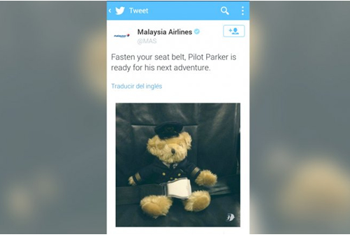 據(jù)阿根廷Infobae網(wǎng)站7月17日報道,馬來西亞航空公司的MH17航班在烏克蘭東部墜毀后,該航空公司刪除了MH17航班出事前的最后一條官方推特。這條英文推特的內(nèi)容是:系上安全帶,飛行員“派克”已經(jīng)準備好了下一次旅程。推特還配了一張玩具熊假扮成飛行員準備起飛的照片。