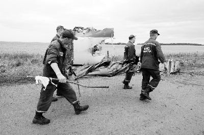 19日,在烏克蘭頓涅茨克州的MH17航班墜機現(xiàn)場,救援人員搬運遇難者遺體圖/新華社
