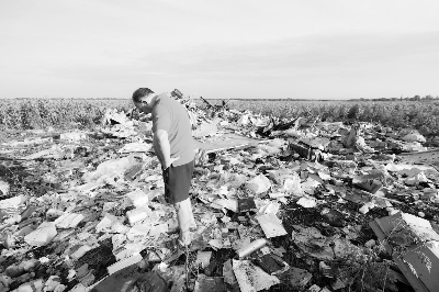 19日,在烏克蘭頓涅茨克州,一名當?shù)孛癖娬驹隈R航MH17航班墜機現(xiàn)場 圖/新華社