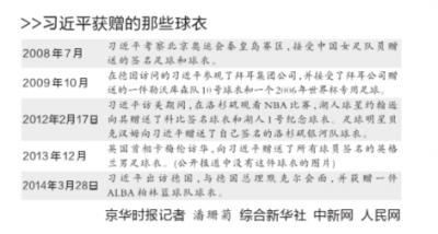 ????作為足球迷,能夠收獲著名球隊、球員的足球和球衣,恐怕是最讓別人羨慕的事兒了。習近平就曾經(jīng)收到球星貝克漢姆簽名的球衣、德甲勒沃庫森隊球衣、2006年世界杯專用足球等,也包括中國女子足球隊隊員簽名的足球。