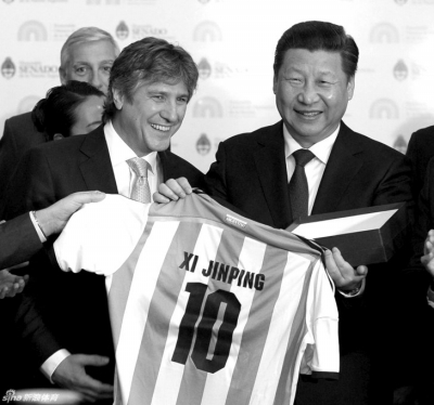 ????在和阿根廷副總統(tǒng)兼參議長布杜及眾議長多明格斯舉行會談時,習近平特別提到阿根廷足球隊在世界杯奪得亞軍,他說:“剛才眾議長先生問我是否喜歡足球,我說我非常喜歡足球。他也祝愿中國能夠早日舉辦一屆世界杯,這正是我的愿望。但是我們足球的發(fā)展,還希望同阿根廷加強交流合作,靠你們的幫助,提高我們的水平?!?/p>
