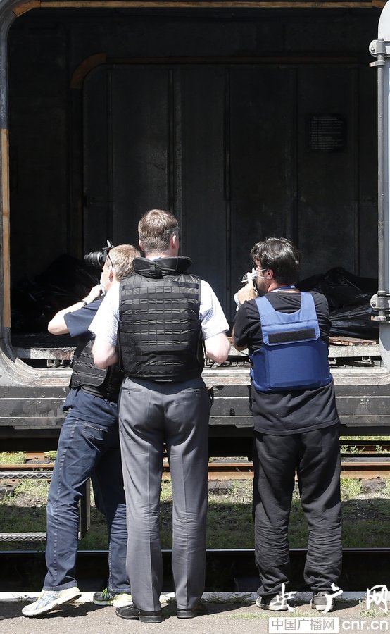 當(dāng)?shù)貢r間2014年7月20日,烏克蘭頓涅茨克Torez,馬航墜機(jī)遇難乘客遺體被裝上列車?yán)洳剀噹麑⒈贿\(yùn)走。載有部分遺體的火車從距空難現(xiàn)場不遠(yuǎn)的烏克蘭托列茲市出發(fā),前往頓涅茨克市?;疖囯x站前,身處空難現(xiàn)場的歐洲安全與合作組織(歐安組織)代表檢查了運(yùn)載遺體的5節(jié)冷藏車廂。