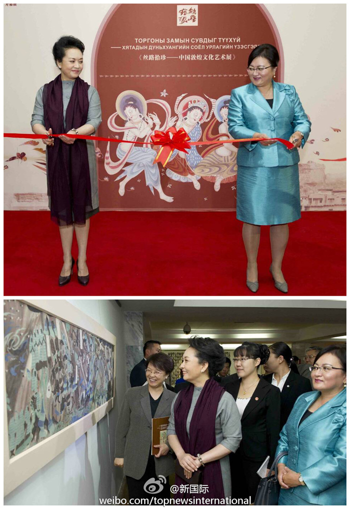 ???? 新華網(wǎng)北京8月22日電 據(jù)新華社“新國(guó)際”微博報(bào)道,習(xí)近平主席夫人彭麗媛和額勒貝格道爾吉總統(tǒng)夫人包勒爾瑪22日上午共同出席為慶祝中蒙建交65周年暨“中蒙友好交流年”舉行的中國(guó)文化周開(kāi)幕式并剪彩,欣賞蒙古國(guó)藝術(shù)家的精彩演出,并參觀中國(guó)敦煌文化藝術(shù)展,觀賞臨摹的敦煌石窟壁畫(huà)、復(fù)制泥塑和樂(lè)器。