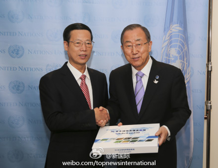 ????新華網(wǎng)北京9月23日電 據(jù)新華社“新國際”微博報(bào)道,國家主席習(xí)近平特使、國務(wù)院副總理張高麗22日在聯(lián)合國總部與聯(lián)合國秘書長潘基文共同出席中國政府向聯(lián)合國捐贈30米分辨率全球地表覆蓋數(shù)據(jù)儀式。張高麗表示,中國政府正式將世界上首套30米分辨率全球地表覆蓋數(shù)據(jù)捐贈給聯(lián)合國,這是為即將舉行的氣候峰會帶來的一份禮物。
