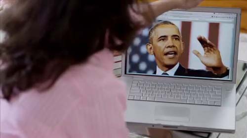 ????剎那間,鏡頭切換到女子的筆記本電腦上:美國總統(tǒng)奧巴馬的頭像鋪滿了全屏。