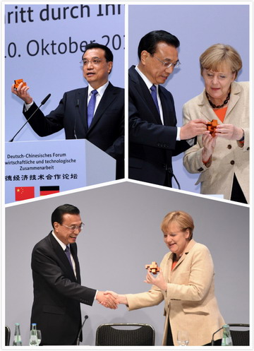 ????李總理說(shuō),這是訪前天津中德職業(yè)技術(shù)學(xué)院師生共同創(chuàng)作的作品,希望我送給默克爾總理。解開魯班鎖是解決一道難題,相信中德之間的合作能不斷創(chuàng)新,共同破解世界性難題,開啟美好的未來(lái)。