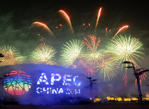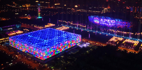 17時40分許,水立方和鳥巢的彩燈已經(jīng)在夜色中閃亮。當晚,國家主席習近平和夫人彭麗媛在北京國家游泳中心(水立方)舉行宴會,歡迎出席APEC會議的各成員經(jīng)濟體領(lǐng)導(dǎo)人或代表及配偶。