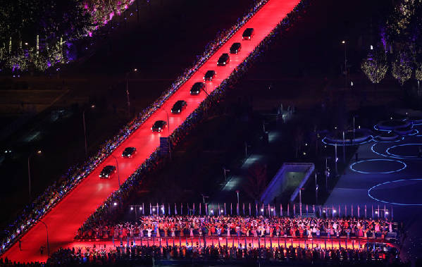 18時許,貴賓的車隊依次駛過鐳射燈照射鋪就的紅地毯,被迎領(lǐng)到水立方。歡迎人群載歌載舞,氣氛熱烈友好。