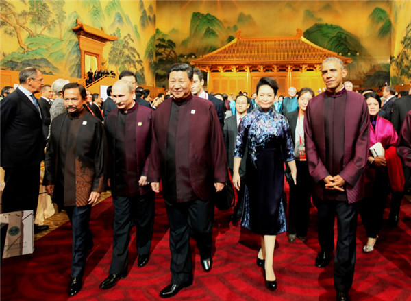 ????18時許,與會貴賓穿著為本次會議專門設(shè)計的特色中式服裝陸續(xù)抵達。習主席說,貴賓們都穿著中國式服裝,讓大家更感親近,就像到鄰居家串門,來朋友家敘舊一樣。