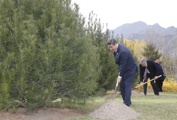11時40分許,習主席與各成員經(jīng)濟體領(lǐng)導(dǎo)人或代表前往植樹。習主席在開幕辭中希望,亞太經(jīng)濟體以北京雁棲湖為新的起點,引領(lǐng)世界經(jīng)濟的雁陣,飛向更加蔚藍而遼闊的天空。
