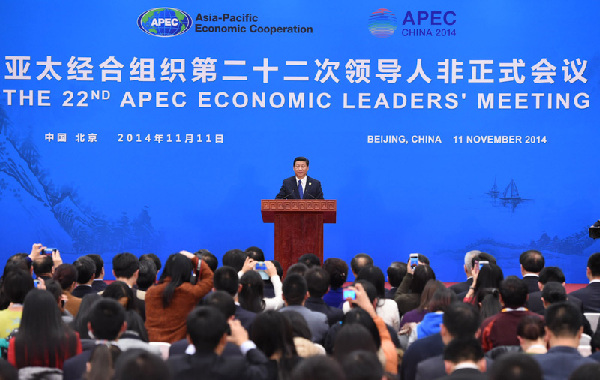 16時許,APEC領(lǐng)導(dǎo)人非正式會議圓滿結(jié)束后,習主席出席記者會并講話。