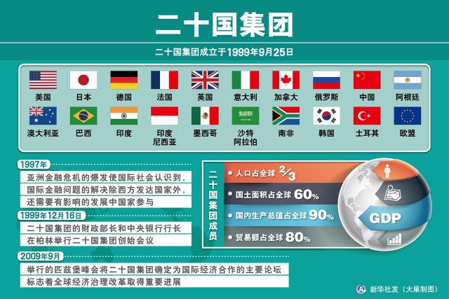 可以說,中國成功地引領(lǐng)了亞太區(qū)域合作方向與政策制定,極大地增強(qiáng)了中國在亞太治理中的發(fā)言權(quán)。如果說,APEC是一個成員限于亞太地區(qū)的區(qū)域性治理平臺,那二十國集團(tuán)(G20)就是一個覆蓋面更廣的、全球性的治理平臺。G20由西方七國集團(tuán)、俄羅斯和中國等主要新興經(jīng)濟(jì)體組成,經(jīng)濟(jì)規(guī)模約占全球90%,貿(mào)易總額占全球總量的80%。