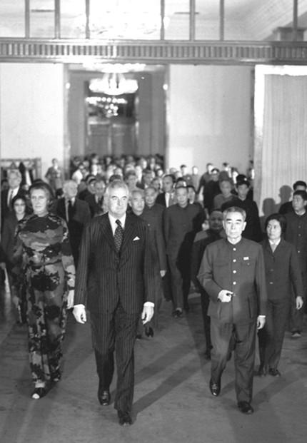 ????惠特拉姆被澳大利亞人譽(yù)為“澳中建交之父”。幾乎與基辛格博士秘密訪華同時(shí),惠特拉姆1971年7月率澳大利亞工黨代表團(tuán)訪華?;萏乩反文贲A得選舉并出任澳大利亞總理后,立即推動(dòng)了澳大利亞與新中國(guó)正式建交,使澳大利亞成為較早與新中國(guó)建交的西方國(guó)家之一。