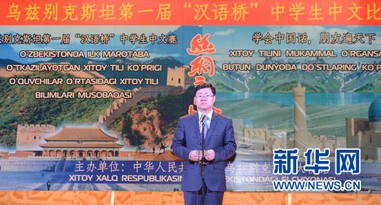 中國駐烏茲別克斯坦大使館孫立杰大使在出席烏茲別克斯坦第一屆“漢語橋”中學生中文比賽。