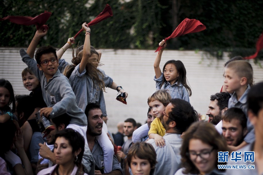 表演結(jié)束后,Jana和同伴們一起慶祝“疊人塔”成功。新華社巴塞羅那分社攝影師Pau Barrena 攝