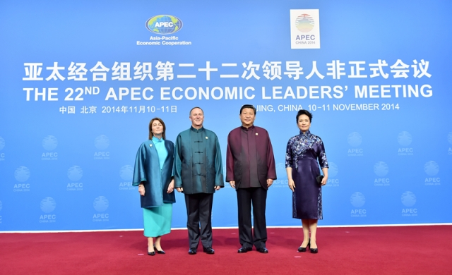 ??? (2014年11月10日,國家主席習近平和夫人彭麗媛迎候新西蘭總理約翰·基夫婦。新華社記者李濤攝)