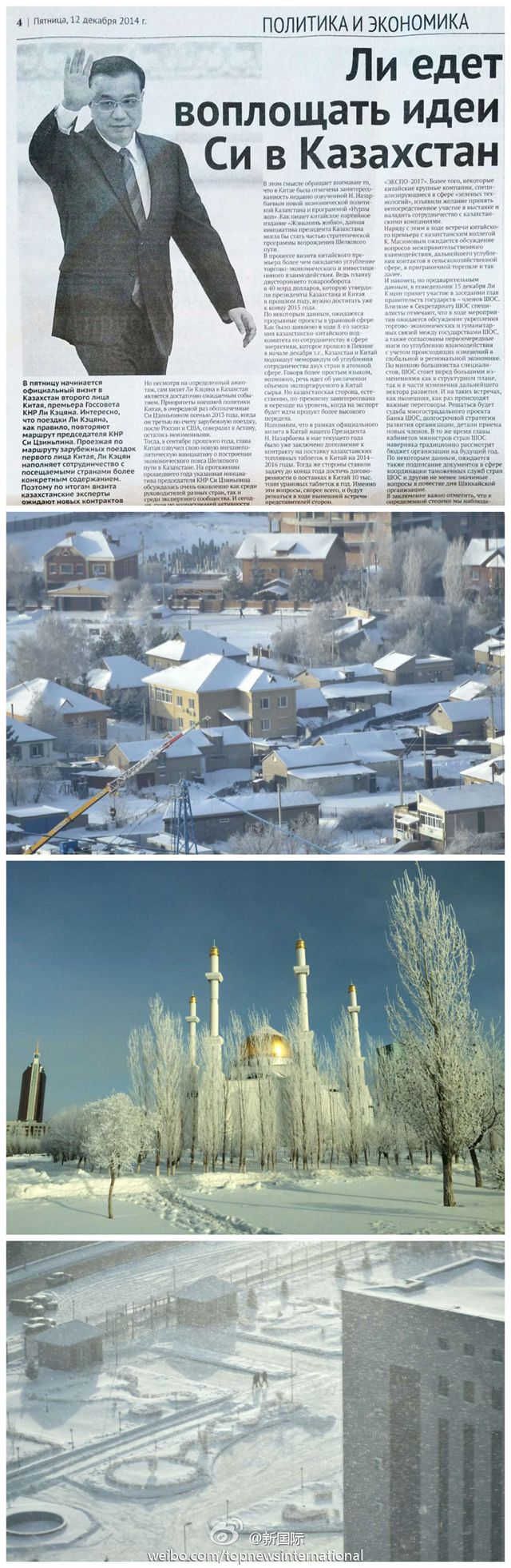 ????新華網(wǎng)北京12月13日電 據(jù)新華社“新國際”微博報(bào)道,哈薩克斯坦首都阿斯塔納冰天雪地,當(dāng)?shù)馗鹘鐚羁藦?qiáng)來訪的期待卻相當(dāng)熱切??偨y(tǒng)府、總理府工作人員周末都在加緊籌備。哈通社記者穆卡諾夫說,中國總理來訪對他們來說是大新聞,他和同事將全程報(bào)道。他很關(guān)心哈中合作,希望中國的發(fā)展和經(jīng)驗(yàn)?zāi)軒椭冒l(fā)展。
