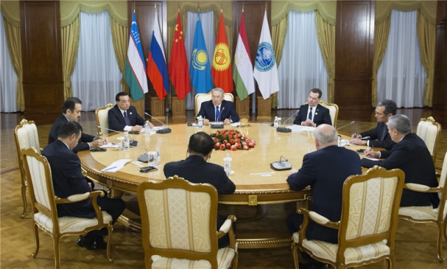 ????(納扎爾巴耶夫總統(tǒng)集體會見上合組織成員國總理、秘書長和地區(qū)反恐機構(gòu)執(zhí)委會主任,攝影記者:黃敬文)