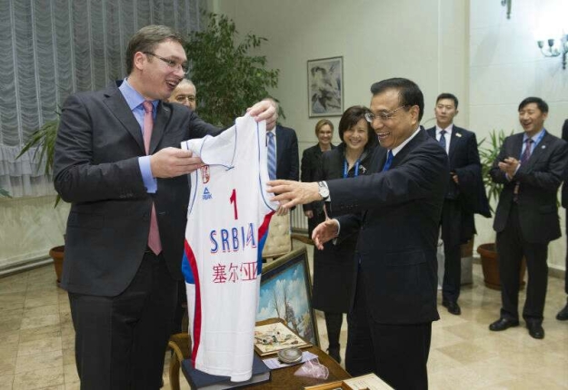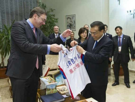 ????新華網(wǎng)北京12月18日電 據(jù)新華社“新華國際客戶端”報道,17日晚,李克強(qiáng)總理收到了一件特別的禮物:塞爾維亞國家籃球隊的1號球衣。武契奇總理贈送的這件白色球衣上特別寫上了李克強(qiáng)名字的中英文。