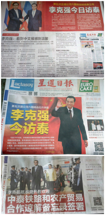 ??? 新華網北京12月20日電 據新華社“新國際”微博報道,泰國媒體紛紛在頭版頭條位置對李克強總理的泰國之行予以報道,社會各界高度關注。泰國《星暹日報》在頭版刊登總理大幅照片,稱總理此行將推動和見證中泰兩國之間簽署多份友好合作協議,并回顧了2013年李克強總理訪泰時的情景。