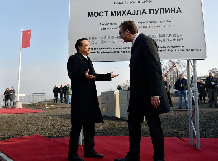 李克強與塞爾維亞總理武契奇出席貝爾格萊德跨多瑙河大橋竣工儀式。中新社 劉震 攝