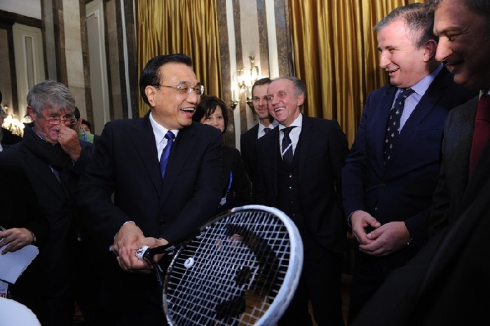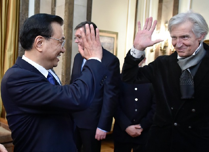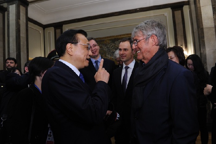 李克強與電影《瓦爾特保衛(wèi)薩拉熱窩》中“吉斯”的扮演者“對暗號”。中新社 劉震 攝