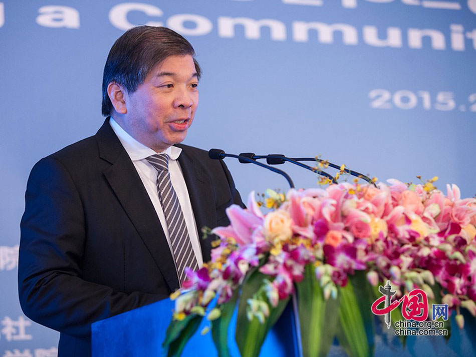 圖為新加坡工商聯(lián)合總會(huì)主席、 新加坡太平船務(wù)董事總經(jīng)理張松聲在“21世紀(jì)海上絲綢之路國際研討會(huì)”高峰論壇發(fā)表演講。中國網(wǎng)記者 鄭亮 攝