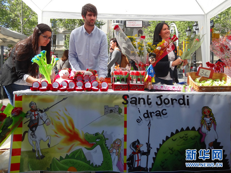 今年的“圣喬治節(jié)”是個天空晴朗陽光燦爛的日子,在巴塞羅那市中心的加泰羅尼亞廣場及周邊街道上,臨時搭建起了很多賣書和賣花的攤位。大街上到處可以見到手持鮮花的女士,或者拿著書的男士。