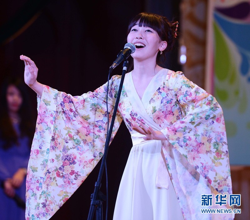 4月28日,在烏內(nèi)務(wù)部文化宮禮堂活動(dòng)現(xiàn)場,塔什干孔子學(xué)院的ARUXAN(中文名:阿魯)在參加比賽。新華網(wǎng)記者 沙達(dá)提攝