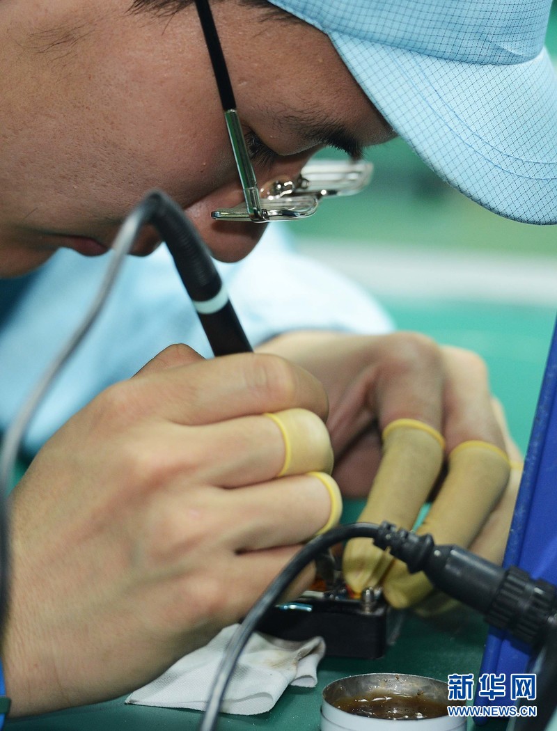 4月18日,在烏茲別克斯坦吉扎克工業(yè)特區(qū)錫爾河分區(qū)的鵬盛工業(yè)園區(qū),工人在鵬中興盛合資有限公司手機生產(chǎn)車間工作。新華社記者沙達提