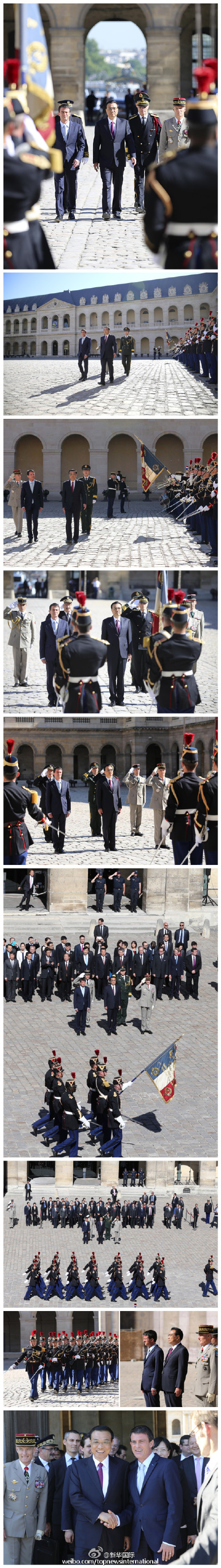 新華網(wǎng)北京7月1日電 據(jù)新華社“新華國際”微博報道,當?shù)貢r間30日上午,法國總理瓦爾斯在榮軍院舉行隆重儀式,歡迎李克強總理訪法。明媚的陽光下,50人方陣的軍樂隊高奏中法兩國國歌,雄壯的《義勇軍進行曲》和激昂的《馬賽曲》響徹榮軍院上空。隨后,儀仗隊舉行分列式,接受中國總理李克強的檢閱。