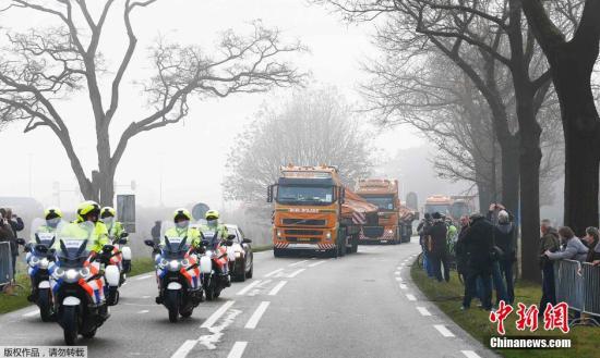 資料圖:當?shù)貢r間2014年12月9日,運送馬航MH17航班殘骸的卡車車隊定于抵達荷蘭南部的希爾澤.賴恩空軍基地。接下來,空難調(diào)查人員將利用殘骸再次拼裝這架客機,以期找出失事原因。