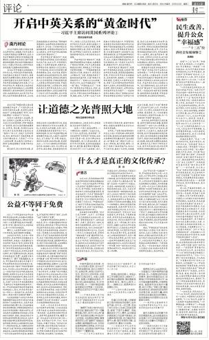 英國駐華大使吳百納連續(xù)用了四個“黃金”來形容習近平主席此次訪英的意義:“今年是中英關(guān)系的黃金年,這將是一次黃金訪問,它證明中英關(guān)系的發(fā)展處于黃金時期。訪問將確立中英面向21世紀的全球伙伴關(guān)系,開啟中英關(guān)系史上的黃金10年。”我們期待并相信,這次為開啟中英關(guān)系“黃金時代”而往的里程碑式訪問,一定能成功打造中英關(guān)系新格局、繪制兩國關(guān)系新藍圖、開辟務(wù)實合作新前景、樹立國際合作新典范。(南方日報評論員)