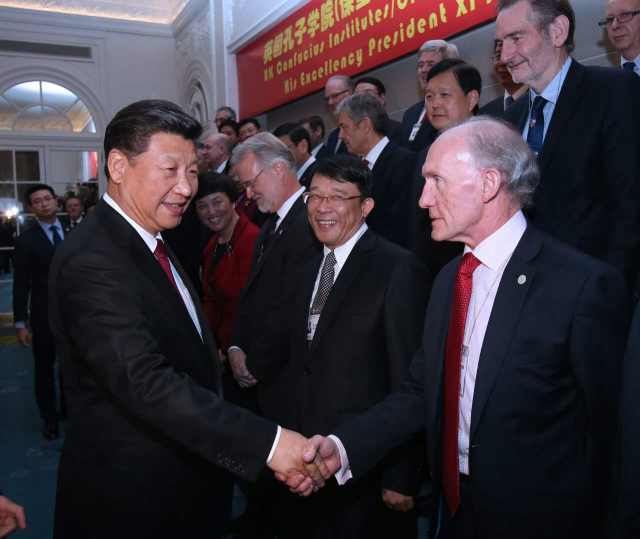 習近平指出,近年來,孔子學院在英國快速發(fā)展。目前,英國已經(jīng)建立起29所孔子學院和126個孔子課堂,數(shù)量居歐洲之首。全英孔子學院取得的碩果也是中英人文交流蓬勃發(fā)展的縮影。通過人文交流,中英兩國文化中的精華正在對兩國人民的思維方式和生活方式產(chǎn)生著奇妙的“化學反應”。“為之不厭,誨人不倦?!毕M谧魑唤處熢俳釉賲?,為中英友好事業(yè)添磚加瓦。希望孔子學院繼續(xù)秉承“相互尊重、友好協(xié)商、平等互利”的校訓,為傳播文化、溝通心靈、促進世界文明多樣性作出新的更大貢獻。