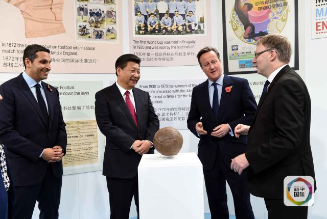 在和習主席一同參觀世界杯冠軍獎杯時,卡梅倫說:“我希望中國隊也能贏得世界杯,上次英國獲得獎杯時是1966年,我和您有同樣的愿望。”