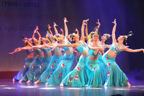 2015年10月27日,中國云南省藝術(shù)團(tuán)在越南首都河內(nèi)表演傣族舞蹈《美的祝?!罚瑧c祝中越建交65周年。