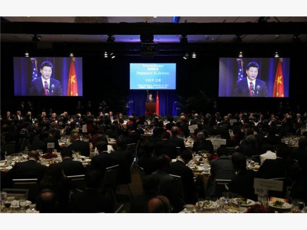 ——習(xí)主席2015年9月22日在美國華盛頓州西雅圖市,出席華盛頓州當(dāng)?shù)卣兔绹押脠F體聯(lián)合舉行的歡迎宴會時發(fā)表演講。