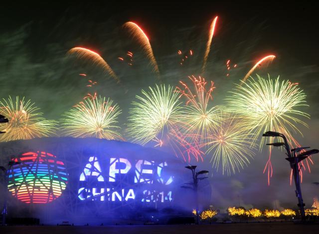 2014年11月10日,北京在奧林匹克公園舉行焰火表演。APEC第二十二次領導人非正式會議2014年11月10日至11日在北京舉行。新華社記者羅曉光攝