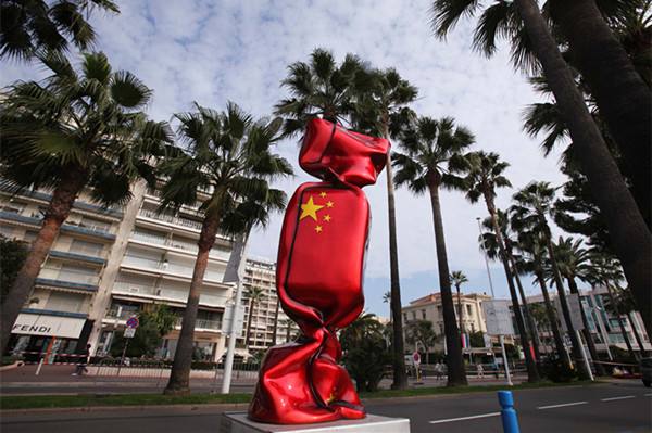 2011年11月3日至4日,G20領(lǐng)導(dǎo)人峰會在戛納舉行。圖為10月31日在法國南部小城戛納拍攝的外表被包裝成中國國旗的糖果雕塑。新華社記者高靜攝