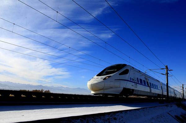 圖為2014年 12月13日,一列測試動車在蘭新高鐵甘肅段疾馳 蔡增樂攝