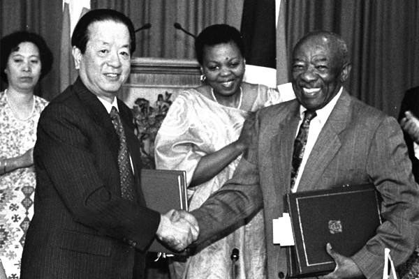 1997年12月30日,中國與南非簽署建交聯(lián)合公報(bào)。圖為錢其琛與恩佐交換文本后握手。(新華社記者李學(xué)仁攝)