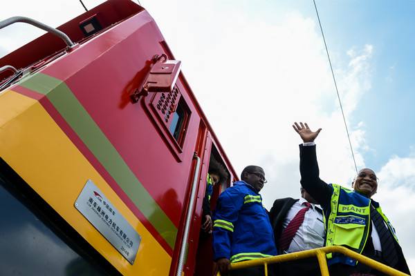 2015年3月19日,南非總統(tǒng)祖馬(右)從“曼德拉一型” 第95臺(tái)電力機(jī)車上走下來時(shí)向大家揮手致意。(新華社記者翟健嵐攝)