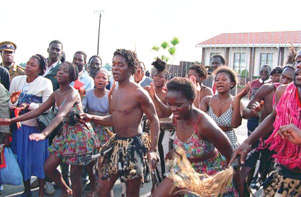 1996年5月22日,津巴布韋首都哈拉雷群眾載歌載舞,歡送中國國家主席江澤民。1996年5月8日至22日,時任中國國家主席江澤民對非洲六國進行了友好訪問。(新華社記者王新慶攝)